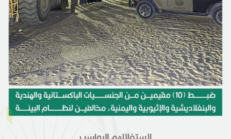 ضبطت القوات الخاصة للأمن البيئي 10 مقيمين مخالفين لنظام البيئة، من الجنسيات الباكستانية، والهندية، والبنغلاديشية، والإثيوبية، واليمنية؛ لاستغلالهم الرواسب في منطقة الرياض، وطُبقت الإجراءات النظامية بحقهم.