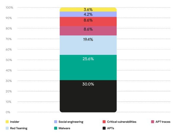 Regarding the nature of such incidents, 30% of them were associated with APTs[3], 26% accounted for malware attacks, and just over 19% resulted from “ethical hacking” (pentests, red teaming or any other types of cyber exercises conducted in customers’ infrastructures either for the security assessment of IT systems or to test the operational readiness of the MDR service). The proportion of incidents involving publicly available critical vulnerabilities and the detection of traces of previous attacks involving humans was around 9%. The remaining incidents resulted from the successful use of social engineering techniques or were linked to insider threats.