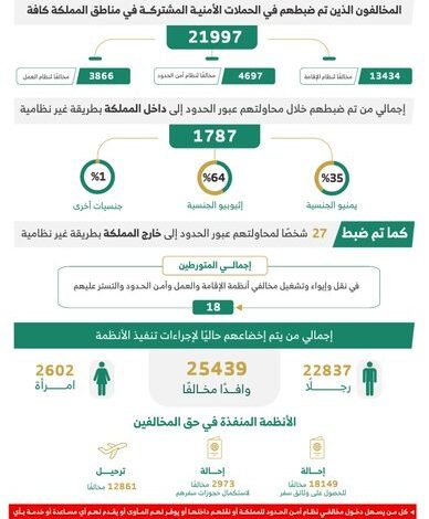أولًا: بلغ إجمالي المخالفين الذين تم ضبطهم بالحملات الميدانية الأمنية المشتركة في مناطق المملكة كافة (21997) مخالفًا، منهم (13434) مخالفًا لنظام الإقامة، و(4697) مخالفًا لنظام أمن الحدود، و(3866) مخالفًا لنظام العمل.