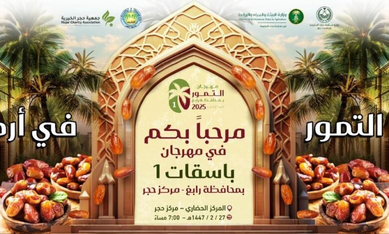 يستعد مكتب وزارة البيئة والمياه والزراعة بمحافظة رابغ، لتدشين مهرجان التمور الأول “باسقات 1″بمركز حجر، وذلك يوم الخميس الموافق ٢٧/ ٢/ ١٤٤٧ هـ ولمدة ثلاثة أيام، بمشاركة المزارعين والجهات الحكومية والأهلية ذات العلاقة، في إطار دعم مزارع النخيل والتمور وتعزيز مكانة المنتج المحلي.