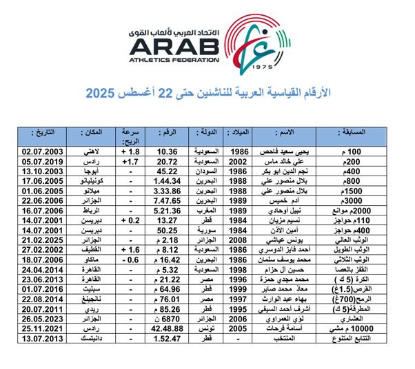 وقد سجّل العديد من الناشئين والناشئات العرب أرقامًا لافتة في مختلف المسابقات، توزعت بين سباقات السرعة والتحمّل، ومنافسات الحواجز والموانع، وصولًا إلى مسابقات الرمي والقفز. هذه الأرقام لم تكن مجرد نتائج، بل رسائل أمل بأن رياضة ألعاب القوى العربية تسير بخطى ثابتة نحو العالمية.