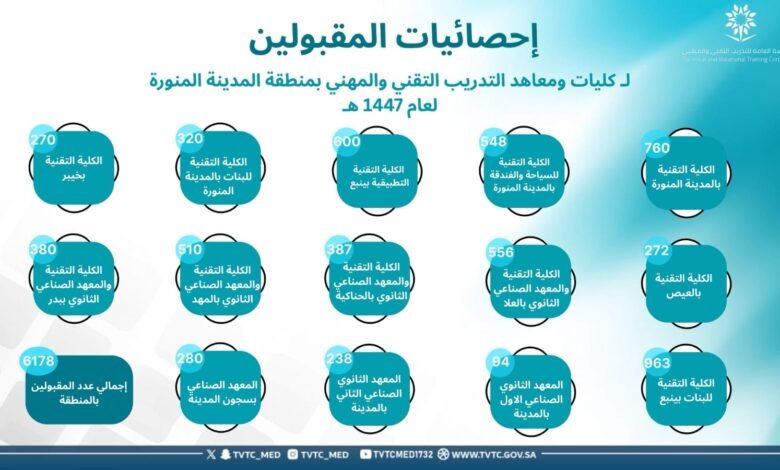 وتضمنت إحصائية القبول في 14 منشأة تدريبية في المنطقة، قبول (760 متدربًا)، في الكلية التقنية بالمدينة المنورة و(548 متدربًا) في الكلية التقنية للسياحة والفندقة بالمدينة المنورة، و(600 متدرب) في الكلية التقنية التطبيقية بينبع، و(320 متدربة) في الكلية التقنية للبنات بالمدينة المنورة، و(963 متدربة) في الكلية التقنية للبنات بينبع، إضافة إلى (270 متدربًا) في الكلية التقنية بمحافظة خيبر، و(556 متدربًا) في الكلية التقنية والمعهد الصناعي الثانوي بمحافظة العلا، و(387 متدربًا) في الكلية التقنية والمعهد الصناعي الثانوي بمحافظة الحناكية، و(510 متدربين) في الكلية التقنية والمعهد الصناعي الثانوي بمحافظة المهد، و(380 متدربًا) في الكلية التقنية والمعهد الصناعي الثانوي بمحافظة بدر، وكذلك (272 متدربًا) في الكلية التقنية بمحافظة العيص، كما تضمن قبول (94 متدربًا) في المعهد الصناعي الأول بالمدينة المنورة، و(238 متدربًا) في المعهد الصناعي الثاني الثانوي بالمدينة المنورة، إضافة إلى (280 متدربًا) في المعهد الصناعي بسجون المدينة المنورة.