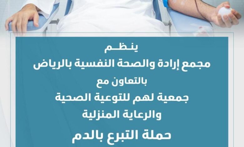 ينظم مجمع إرادة والصحة النفسية بالرياض، بالتعاون مع جمعية “لهم” للتوعية الصحية والرعاية المنزلية، حملة وطنية للتبرع بالدم تستهدف منسوبي المجمع والمراجعين، وذلك في بهو مبنى العيادات الخارجية من الساعة 9:00 صباحًا حتى2:00 ظهرًا.
