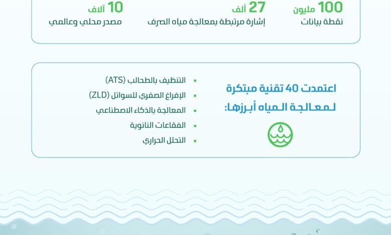 اعتمدت وزارة البيئة والمياه والزراعة (40) تقنية مبتكرة لمعالجة المياه وإعادة استخدامها، أبرزها: التنظيف بالطحالب (ATS)، الفقاعات النانوية، الإفراغ الصفري للسوائل (ZLD)، والتحلل الحراري، والمعالجة المدعومة بالذكاء الاصطناعي، وذلك من خلال تحليل أكثر من (10) آلاف مصدرًا محليًا وعالميًا؛ شمل منشورات علمية وبراءات اختراع وتقارير قطاعية وأخبار، ومتابعة أكثر من (100) مليون نقطة بيانات.