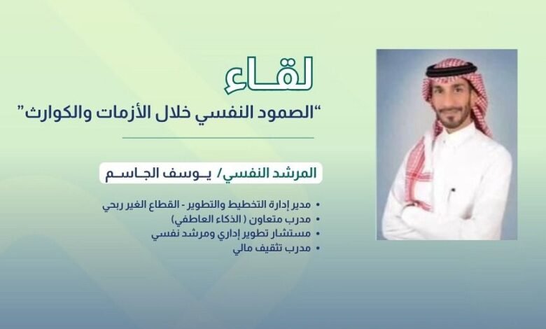 كما بيّن الجاسم أهمية الصمود النفسي من خلال دور الأخصائيين والأطباء والمرشدين النفسيين في حماية الأفراد، موضحًا أنه يتمثل في قدرة الشخص على التحدي في المواقف النفسية من خلال آليات التفكير والمرونة النفسية. وذكر أن أكثر الاضطرابات شيوعًا التي قد يواجهها الفرد أثناء الكوارث هي اضطراب القلق، والاكتئاب، والخوف لما بعد الصدمة.