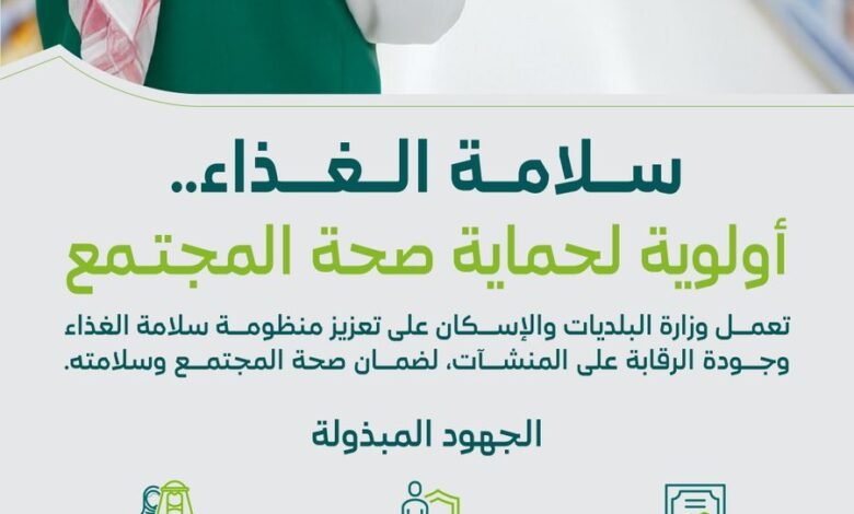 أكدت وزارة البلديات والإسكان استمرار جهودها في تعزيز سلامة الغذاء ورفع كفاءة الرقابة الصحية على المنشآت الغذائية في مختلف مناطق المملكة، ضمن مساعيها لتحقيق أعلى معايير الصحة العامة وجودة الحياة، ودعم مستهدفات رؤية السعودية 2030 في بناء مدن صحية ومستدامة، وذلك تزامنًا مع يوم الغذاء العالمي الذي يصادف السادس عشر من أكتوبر من كل عام.
