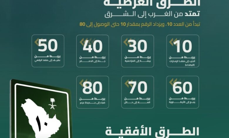 أوضحت الهيئة العامة للطرق نظام ترقيم الطرق السريعة في المملكة العربية السعودية، مشيرةً إلى أنه يعتمد على تقسيم معتمد يصنّف الطرق إلى عرضية وطولية. يسهم هذا النظام في تخطيط الطرق، وتحديد اتجاهاتها واحتياجاتها، وتعزيز الربط بين المدن، لضمان سلامة مستخدميها، وتوفير تجربة قيادة متميزة.