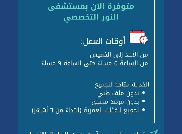الخدمة متاحة من الأحد إلى الخميس، من الساعة 5 مساءً حتى 9 مساءً، وتشمل جميع الفئات العمرية ابتداءً من 6 أشهر، دون الحاجة لملف طبي أو موعد مسبق.