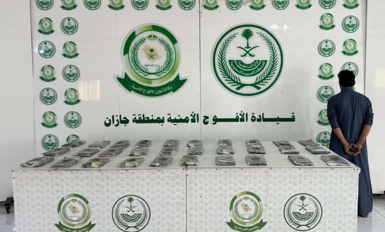 دوريات الأفواج الأمنية بمنطقة جازان تقبض على شخص لترويجه 33كلجم من الحشيش المخدر