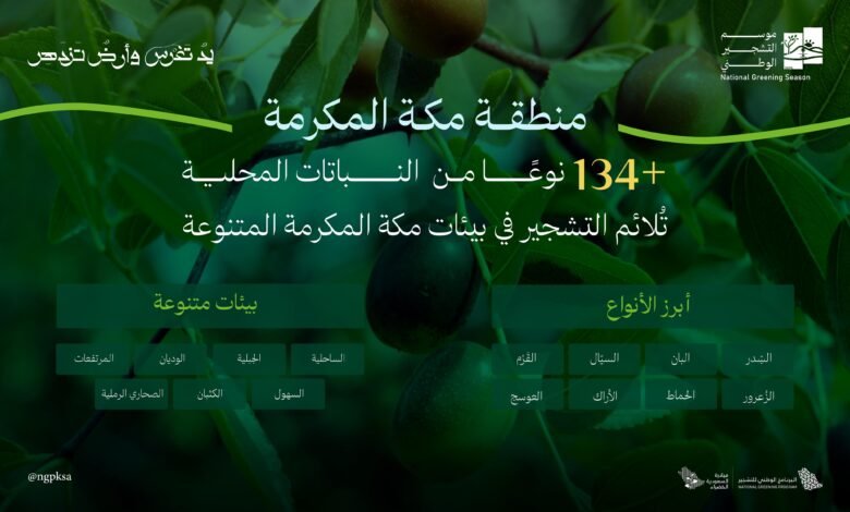 البرنامج الوطني للتشجير: تنوع بيئي فريد يُسهم في انتشار 134 نوع من النباتات المحلية الملائمة للتشجير في مكة المكرمة