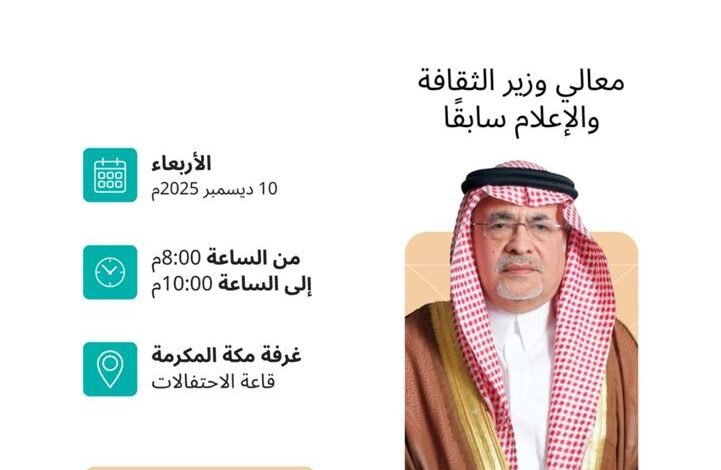ينظِّم فرع هيئة الصحفيين السعوديين بمنطقة مكة المكرمة مساء غدٍ الأربعاء الموافق 10 ديسمبر 2025م، لقاءً لأعضائه مع معالي وزير الثقافة والإعلام الأسبق الدكتور عبدالعزيز بن محيي الدين خوجة بالتعاون مع غرفة مكة المكرمة، تحت عنوان: “الصحافة في المملكة: رؤى وتطلعات، فُرص وتحديات”. بحضور عدد من الإعلاميين والإعلاميات والمسؤولين والمهتمين بالقطاع، وذلك في مقر غرفة مكة المكرمة.