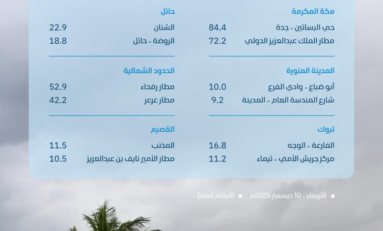 وأوضح التقرير، تسجيل منطقة الحدود الشمالية 52,9 ملم في مطار رفحاء، و42,2 ملم في مطار عرعر، و23,5 ملم في رفحاء، و17,2 ملم في عرعر. فيما سجّلت الشنان في منطقة حائل 22,9 ملم، والروضة بحائل 18,8 ملم، وحي الورود بالشنان 16,9 ملم، ومزارع شركة نادك ببقعاء 10,2 ملم، والشيحية ببقعاء 9,5 ملم. وسجّلت منطقة تبوك 16,8 ملم في الفارعة بالوجه، و11,2 ملم في مركز جريش الأمني بتيماء، و3,2 ملم في العمود بضباء، و2,2 ملم في شواق بضباء.