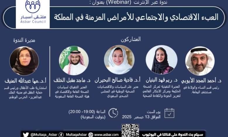 ملتقى أسبار ينظّم ندوة افتراضية حول “العبء الاقتصادي والاجتماعي للأمراض المزمنة في المملكة”