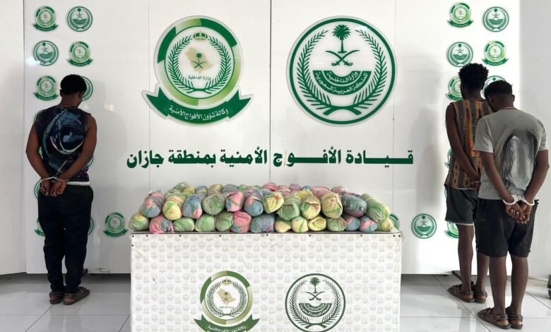 دوريات الأفواج الأمنية بمنطقة جازان تقبض على3 مخالفين لنظام أمن الحدود لتهريبهم21كلجم من القات المخدر