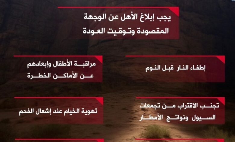 وشددت على أهمية متابعة الأطفال وعدم تركهم حول مناطق تجمعات المياه والسيول، وعدم السباحة فيها، وتهوية الخيام عند إشعال الفحم، وإطفاء النار قبل النوم، وتوفير طفاية حريق مناسبة أثناء الرحلة.