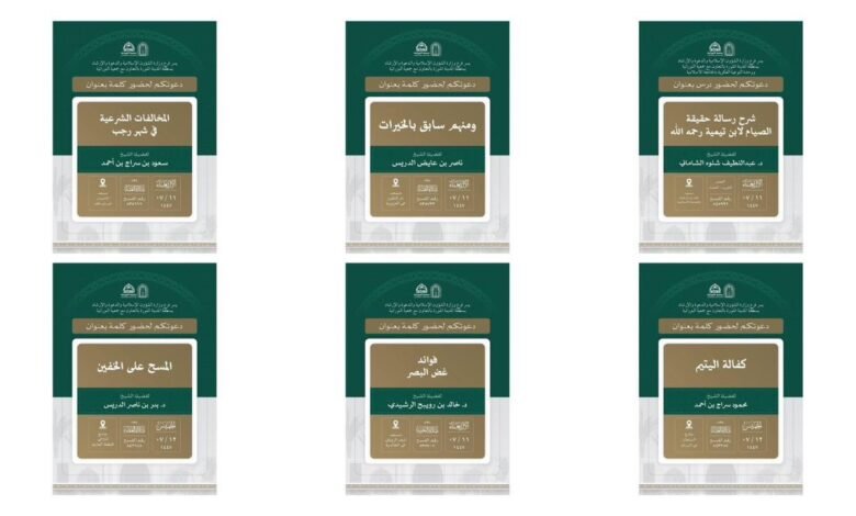 ومن جهة أخرى نفذت وزارة الشؤون الإسلامية والدعوة والإرشاد، ممثلة بفرعها بمنطقة المدينة المنورة ـ إدارة المساجد بمحافظة الحناكية ـ، يومي الأحد والاثنين الثامن والتاسع من شهر رجب لعام 1447هـ، سلسلة من المحاضرات الدعوية النسائية بعنوان: “التحذير من الحلف بغير الله وبيان صوره “، وذلك في كلٍ من دار أم كلثوم، وميمونه ـ رضي الله عنهما -، حيث تناولت المحاضرات عدداً من المحاور من أبرزها: بيان حرمة الحلف بغير الله وبعض الأدلة على ذلك، إضافة إلى ذكر بعض أحكام الحلف بغير الله وبعض صوره.