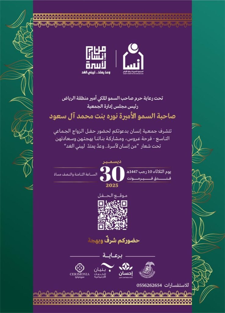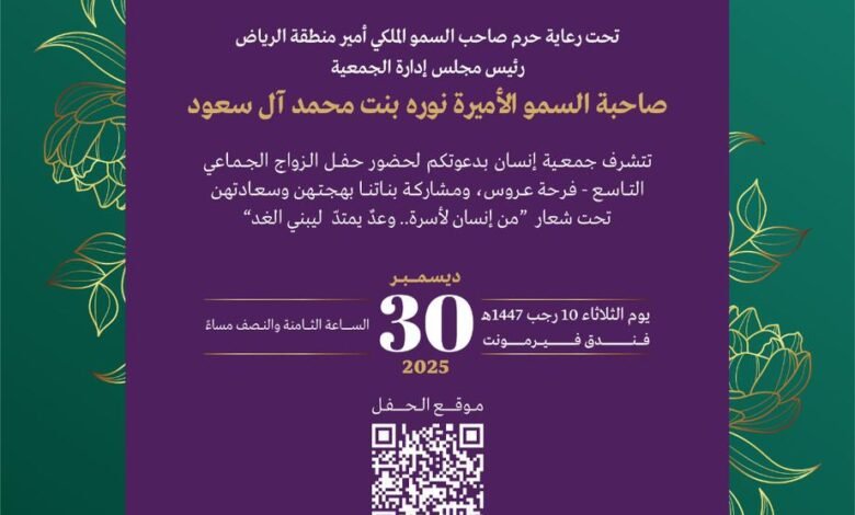 رعت صاحبة السمو الأميرة نورة بنت محمد آل سعود، حرم صاحب السمو الملكي الأمير فيصل بن بندر بن عبدالعزيز أمير منطقة الرياض، ورئيس مجلس إدارة الجمعية الخيرية لرعاية الأيتام (إنسان)، حفل زفاف 167 عروسًا في نسخته التاسعة، والذي جاء تحت عنوان «من إنسان لأسرة… وعدٌ يمتد لنبني الغد» وذلك بحضور عددٍ من الشخصيات الاجتماعية والداعمات وامهات العرائس والإعلاميات ومديرات الفروع وشابات الهلال الاحمر السعودي، وجمعٍ من المهتمات بالشأن الأسري والمجتمعي، مساء يوم الثلاثاء 30 ديسمبر 2025م حفل الزواج الجماعي، وذلك قبل نهاية العام، في أجواء احتفالية جسّدت معاني التكافل الاجتماعي ودعم الشابات المقبلات على الزواج.