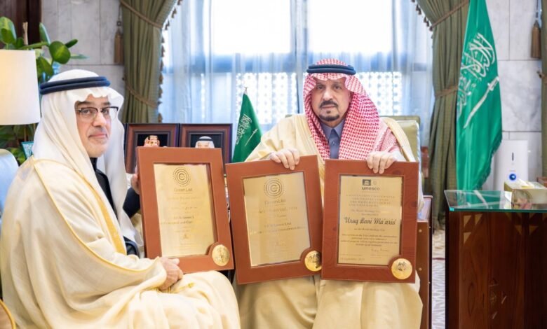وتسلم سمو الأمير فيصل بن بندر شهادتي إدراج محمية الوعول ومحمية عروق بني معارض ضمن القائمة الخضراء التابعة للاتحاد الدولي لصون الطبيعة، وشهادة تسجيل محمية عروق بني معارض في قائمة اليونسكو للتراث العالمي، بعد استيفائهما المعايير المطلوبة.