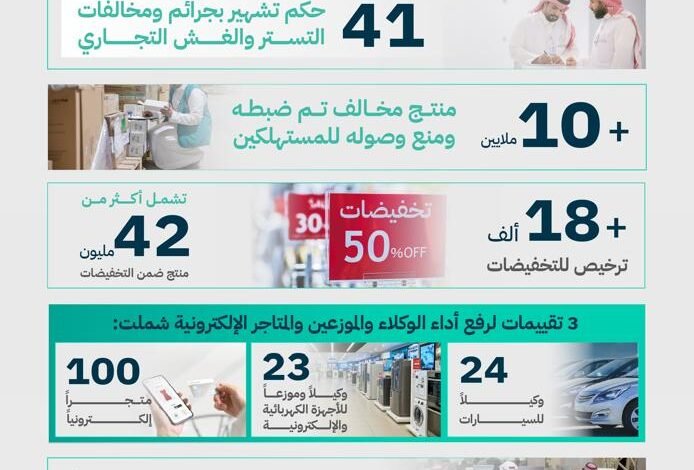 كما أصدرت الوزارة خلال الفترة نفسها، أكثر من 18 ألف ترخيص تخفيضات شملت أكثر من 42 مليون منتج، كما نشرت 41 حكم تشهير بجرائم التستر والغش التجاري تطبيقًا للأنظمة.