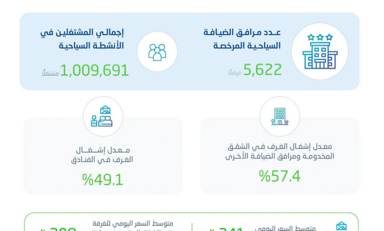وأظهرت نتائج النشرة أن إجمالي عدد مرافق الضيافة السياحية المرخَّصة في المملكة العربية السعودية خلال الربع الثالث من عام 2025م بلغ (5,622) مرفقًا، مسجلًا ارتفاعًا بنسبة 40.6% مقارنة بالربع المماثل من عام 2024م، حيث بلغ آنذاك (3,998) مرفقًا. وقد استحوذت الشقق المخدومة ومرافق الضيافة الأخرى على ما نسبته 52.6% من الإجمالي بعدد بلغ (2,955) مرفقًا، في حين بلغ عدد الفنادق (2,667) فندقًا بنسبة 47.4% من إجمالي مرافق الضيافة السياحية المرخصة خلال الفترة نفسها.