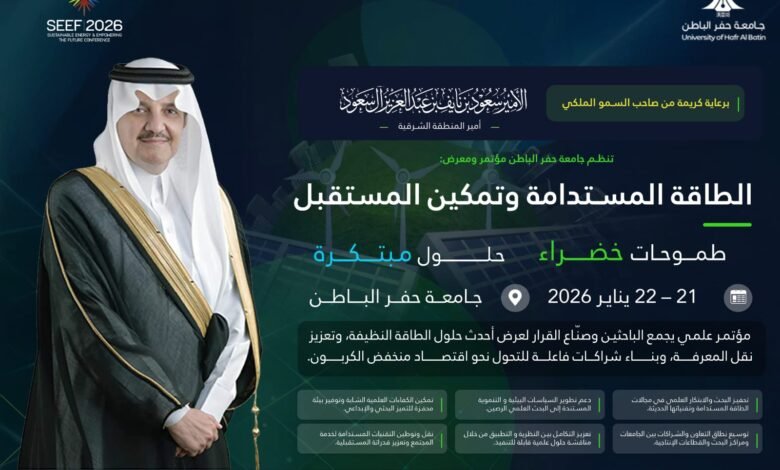 تحت رعاية كريمة من صاحب السمو الملكي الأمير سعود بن نايف بن عبدالعزيز آل سعود، أمير المنطقة الشرقية، تنظم جامعة حفر الباطن مؤتمر ومعرض الطاقة المستدامة وتمكين المستقبل SEEF2026