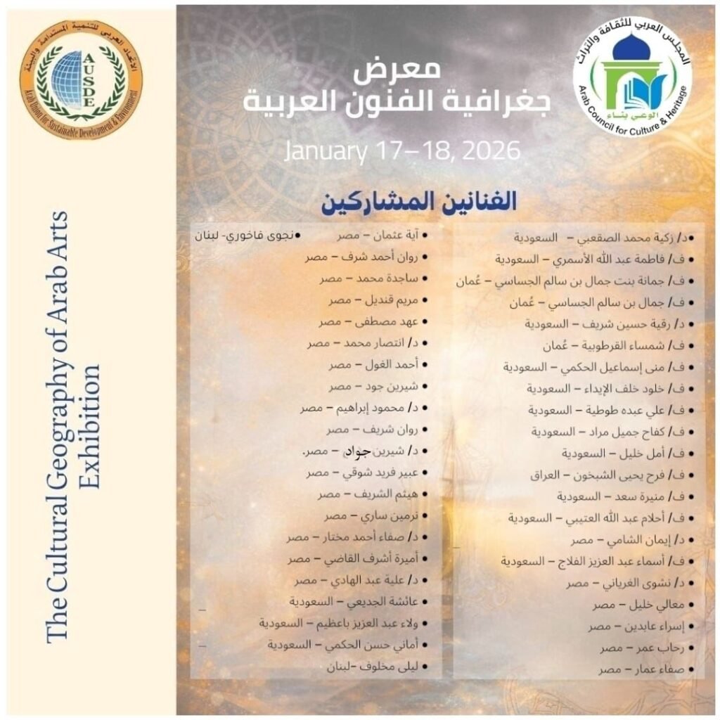 أعلن المجلس العربي للثقافة و التراث تنظيم معرض فني عربي يقام في مقر الجمعية الجغرافية المصرية بالقاهرة، في إطار تعزيز التعاون الثقافي العربي والشراكة الإبداعية بين جمهورية مصر العربية والمملكة العربية السعودية. ويأتي المعرض كإطالة لدور التعاون المصري–السعودي في مجال الفنون، بمشاركة مؤسسات ومبدعين من البلدين ومجموعة من الدول العربية.