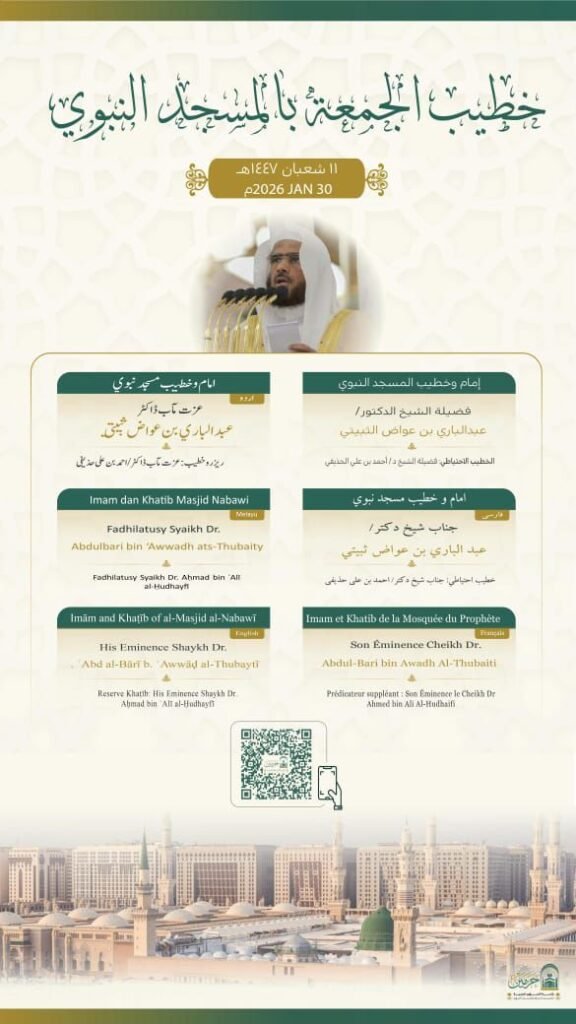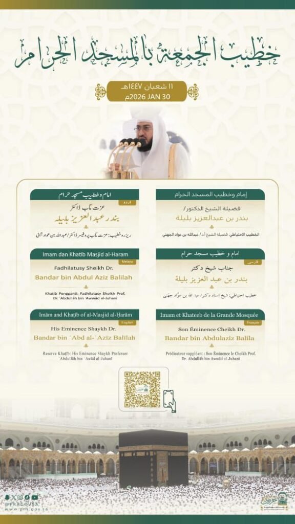 اعتمدت رئاسة الشؤون الدينية بالمسجد الحرام والمسجد النبوي، أسماء خطيبا وإماما صلاة الجمعة في الحرمين الشريفين ليوم بعد غد 11 شعبان 1447هـ وذلك ضمن جدولها الدوري لتنظيم الإمامة والخطابة.