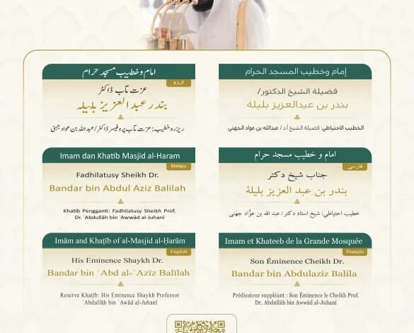 وسيتولى فضيلة الشيخ الدكتور بندر بن عبدالعزيز بليلة إمامة المصلين وإلقاء خطبة الجمعة في المسجد الحرام.
