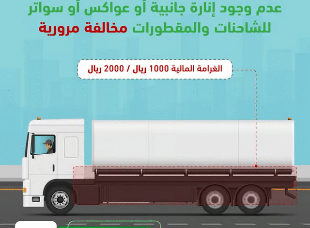 حذّرت الإدارة العامة للمرور قائدي الشاحنات والمقطورات من التهاون في استكمال اشتراطات السلامة اللازمة على الطرق، مؤكدة أن عدم وجود الإنارة الجانبية أو العواكس أو السواتر الجانبية يُعد مخالفة مرورية تستوجب العقوبة.