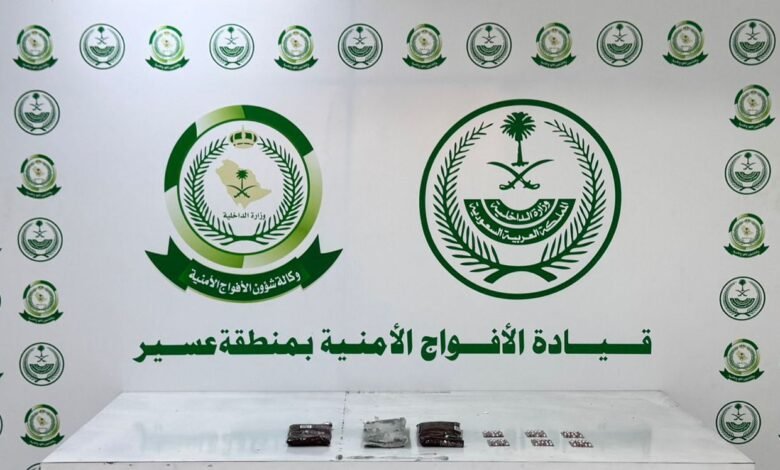 دوريات الأفواج الأمنية بمنطقة عسير تحبط تهريب 90 قرصًا خاضعًا لتنظيم التداول الطبي و 3 كلجم من القات المخدر