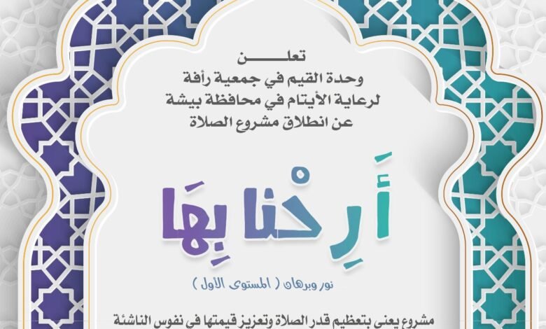 في إطار جهودها التربوية الرامية إلى غرس القيم الإيمانية في نفوس النشء، أعلنت وحدة القيم في جمعية رأفة لرعاية الأيتام بمحافظة بيشة عن انطلاق مشروعها التربوي «أرحنا بها» – نور وبرهان (المستوى الأول) الموجَّه لطلاب المرحلة الابتدائية.