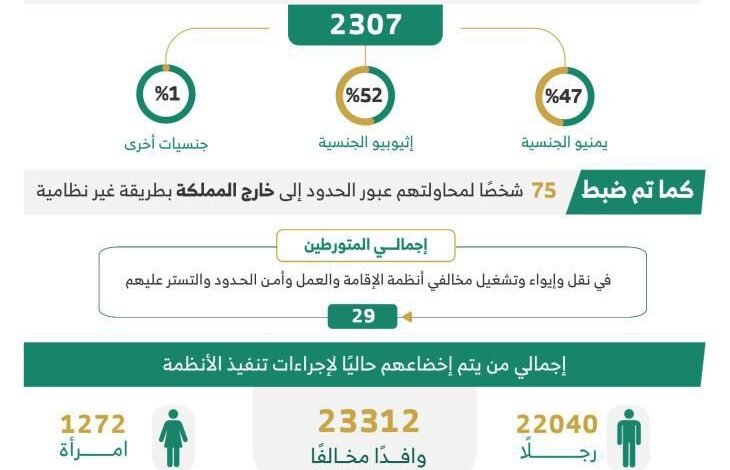 ثانيًا: بلغ إجمالي من تم ضبطهم خلال محاولتهم عبور الحدود إلى داخل المملكة (2307) أشخاص (47%) منهم يمنيو الجنسية، و(52%) إثيوبيو الجنسية، وجنسيات آخرى (01%)، كما تم ضبط (75) شخصًا لمحاولتهم عبور الحدود إلى خارج المملكة بطريقة غير نظامية.