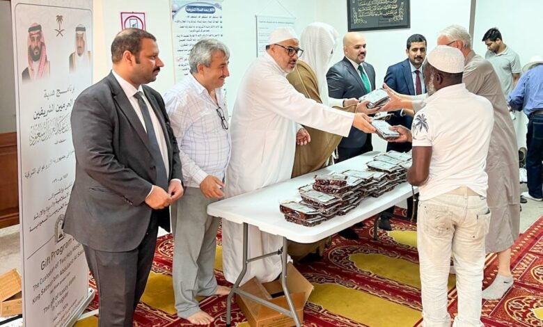 وخلال الحفل ألقى الشيخ إبراهيم الألفي كلمة عبّر فيها عن شكره وتقديره للمملكة العربية السعودية قيادةً وشعبًا، وعلى رأسها خادم الحرمين الشريفين الملك سلمان بن عبدالعزيز آل سعود، وسمو ولي العهد الأمير محمد بن سلمان – حفظهما الله – على ما تقدمه من دعم ورعاية للمسلمين في مختلف أنحاء العالم، مشيدًا بالبرامج التي تنفذها المملكة لخدمة الجاليات الإسلامية، ومنها توزيع التمور وبرامج الإمامة والدعوة.