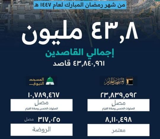 أكثر من ٤٣,٨ مليون قاصد للحرمين الشريفين خلال العشر الأوائل من شهر رمضان