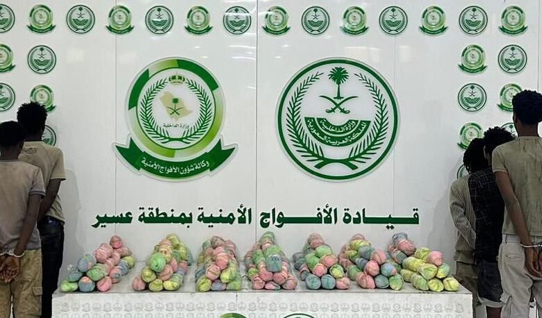 دوريات الأفواج الأمنية بمنطقة عسير تقبض على 5 مخالفين لنظام أمن الحدود لتهريبهم 30 كلجم من القات المخدر