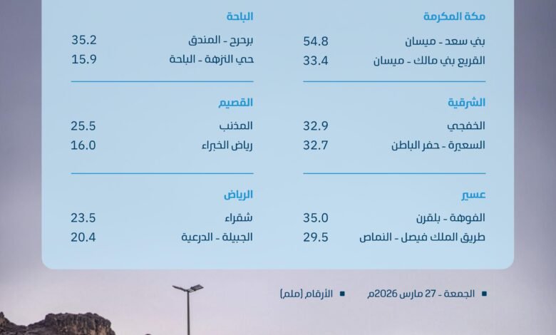 وبيّن التقرير أن وادي الفرع في منطقة المدينة المنورة سجّل 10,8 ملم، وأبو ضباع بوادي الفرع 10,0 ملم، والفقرة بالمدينة 9,2 ملم، وكلٌ من الحمنة، ومستشفى الحمنة بوادي الفرع 8,2 ملم، واليتمة بوادي الفرع 7,2 ملم، والحسو بالحناكية 6,6 ملم. وسجّلت منطقة تبوك 7,8 ملم في رحيب، و6,4 ملم في الفارعة بالوجه، و5,2 ملم في مطار البحر الأحمر الدولي، و4,8 ملم في كلٍ من مركز جريش الأمني بتيماء، وطريق إبراهيم الخليل بتبوك، و3,2 ملم في الديسة بضباء، و3,0 ملم في كلٍ من الحرجة، ومطار الوجه. كما سجّلت الحدود الشمالية 5,5 ملم في مطار عرعر، و3,6 ملم في عرعر، و3,2 ملم في أم خنصر بعرعر، و2,6 ملم في الخالدية بطريف. وسجّلت منطقة الجوف 4,6 ملم في ميقوع بطبرجل، و2,7 ملم في المرير بسكاكا، و2,6 ملم في محمية الملك سلمان، و2,4 ملم في أبو عجرم بدومة الجندل. وسجّلت الشملي في منطقة حائل 2,4 ملم، وموقق 2,0 ملم، وعقدة بحائل 1,6 ملم، والكهفة بالشنان 1,1 ملم. وسجّلت منطقة نجران 0,9 ملم في بدر الجنوب، و0,5 ملم في مطار شرورة.