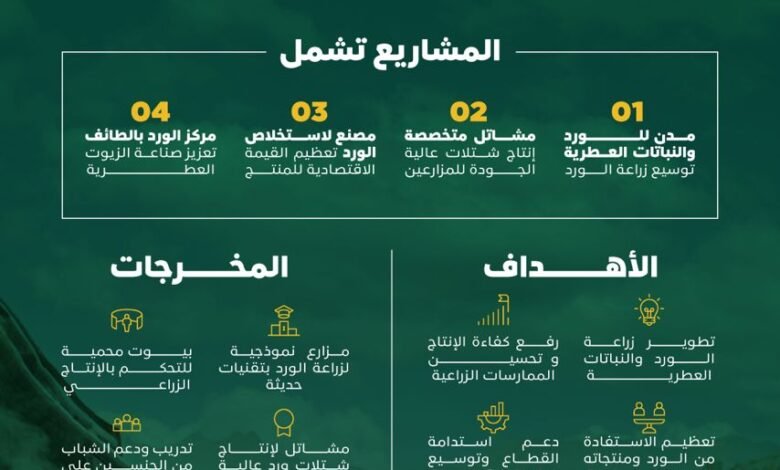 وأوضح المتحدث الرسمي لـ “ريف السعودية” ماجد البريكان، أن المشاريع التي تم الإعلان عنها، شملت إنشاء مُدن ومشاتل للورود والنباتات العطرية في محافظة أحد المسارحة، ومحافظة أبو عريش (المتنزه الوطني) بمنطقة جازان، وإنشاء مصنع استخلاص للورود والنباتات، ومشاتل في محافظة أبو عريش (المتنزه الوطني) بمنطقة جازان، بالإضافة إلى مشروع إنشاء مركز الورد بالطائف، الذي توقف العمل به لاستكمال بعض الدراسات الخاصة بالمشروع.