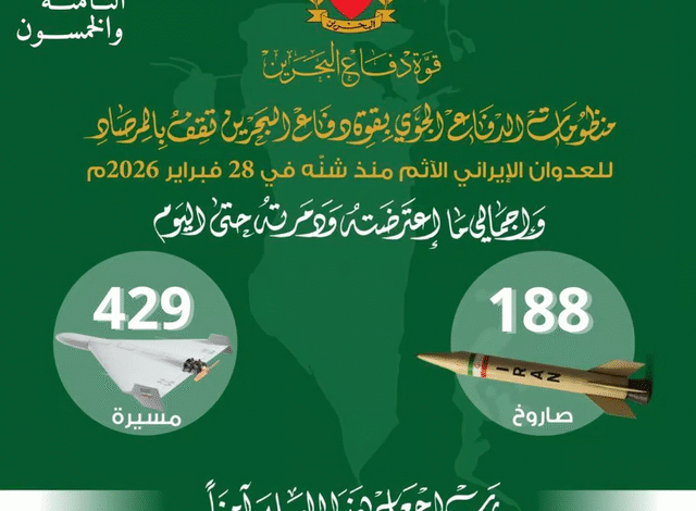 تُعلن القيادة العامة لقوة دفاع البحرين أن منظومات الدفاع الجوي بقوة دفاع البحرين بفضلٍ من الله، ثم بيقظة رجالها مستمرة في مواجهة موجات تتابعية من الاعتداءات الإيرانية الإرهابية الآثمة حيث تم منذ بدء الاعتداء الغاشم اعتراض وتدمير 188 صاروخ و 429 طائرة مسيرة، استهدفت مملكة البحرين.