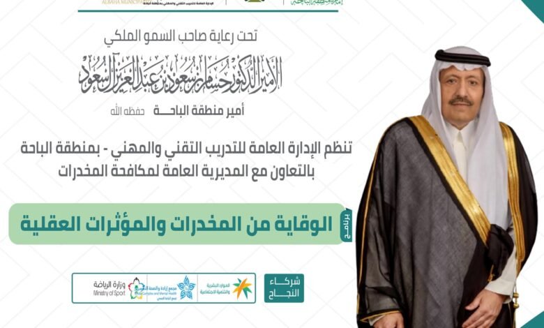 تحت رعاية صاحب السمو الملكي الأمير الدكتور حسام بن سعود بن عبدالعزيز أمير منطقة الباحة – حفظه الله – تنطلق غداً الأحد الموافق 24 شوال 1447هـ، فعاليات برنامج الوقاية من المخدرات والمؤثرات العقلية، الذي تنظمه الإدارة العامة للتدريب التقني والمهني، بالتعاون مع المديرية العامة لمكافحة المخدرات بمنطقة الباحة، وبمشاركة عدد من الجهات ذات العلاقة، وذلك بمقر الإدارة العامة.