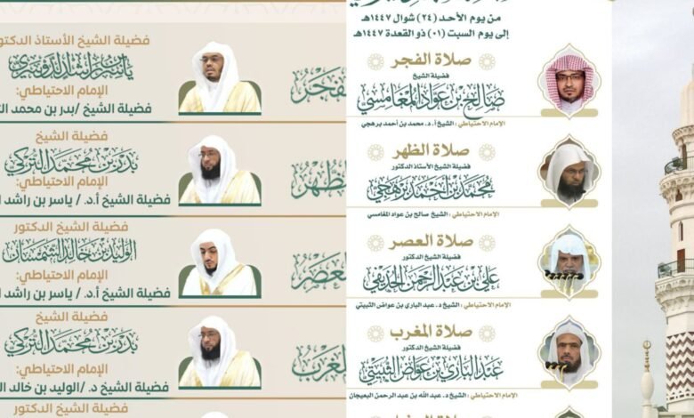 رئاسة الشؤون الدينية بالحرمين الشريفين تحدد الجدول الأسبوعي لأئمة الحرمين من اليوم 24 شوال إلى 1 ذو القعدة 1447هـ