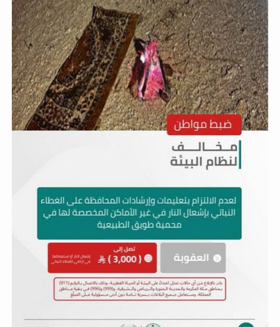 وأكدت القوات أن عقوبة إشعال النار في غير الأماكن المخصصة لها في الغابات والمتنزهات الوطنية غرامة تصل إلى (3,000) ريال، حاثة على الإبلاغ عن أي حالات تمثل اعتداءً على البيئة أو الحياة الفطرية على الرقم (911) بمناطق مكة المكرمة والمدينة المنورة والرياض والشرقية، و (999) و (996) في بقية مناطق المملكة، وستعامل جميع البلاغات بسرية تامة دون أدنى مسؤولية على المبلّغ.