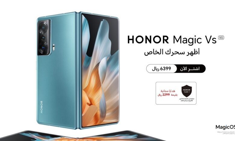 هاتف HONOR Magic Vs 5G مُتاحاً للشراء في أسواق المملكة العربية السعودية بسعر 6399 ريال سعودي، إلى جانب هدايا خاصة بقيمة2299  ريال سعودي، تشمل خدمة HONOR Care+ (6 أشهر من الحماية على الشاشة + 30 يوم من الاستبدال عند التلف )