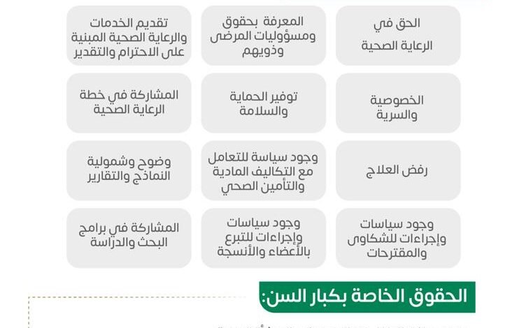 كما أشارت حقوق المرضى من الأطفال إلى ضرورة توفر الأجهزة والأدوات والمستلزمات الخاصة بالطفل في المنشأة، ووجود سياسة خاصة لحماية الأطفال من كل أشكال الإيذاء، وتوفر البيئة المناسبة للطفل التي تساعده على التكيف أثناء فترة العلاج بالمنشأة الصحية، مع التزام الفريق الطبي بالتبليغ عن كافة حالات العنف ضد الطفل للجهة المعنية.