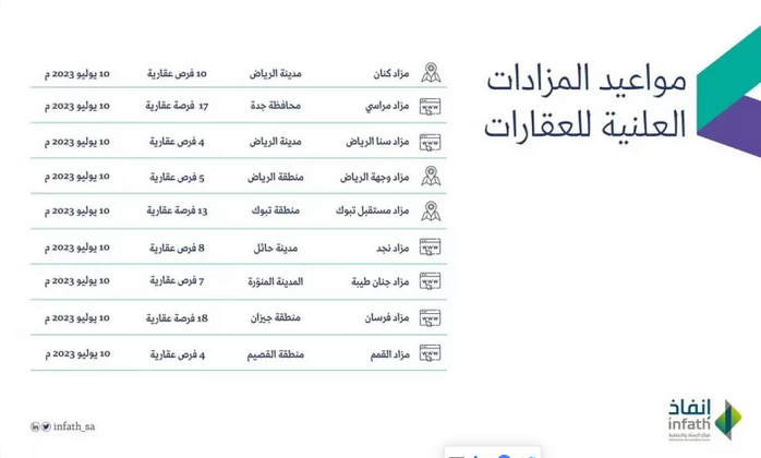 ويبدأ المزاد بـ 19 عقارًا في منطقة الرياض في مزادات كنان الحضوري، وسنا الرياض الإلكتروني، ووجهة الرياض الحضوري، ثم 17 عقارًا بمحافظة جدة في مزاد مراسي الإلكتروني، و13 عقارًا بمنطقة تبوك في مزاد مستقبل تبوك الحضوري، ثم 8 عقارات بمنطقة حائل في مزاد نجد الإلكتروني، و7 عقارات في منطقة المدينة المنورة في مزاد جنان طيبة، و18 عقارًا في منطقة جازان في مزاد فرسان الإلكتروني، وأخيرًا 4 عقارات بمنطقة القصيم في مزاد مشارف القمم الإلكتروني.