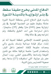 الدفاع المدني بمنطقة المدينة المنورة يباشر حادثة سقوط مقيم من الجنسية الهندية في بئر ارتوازية