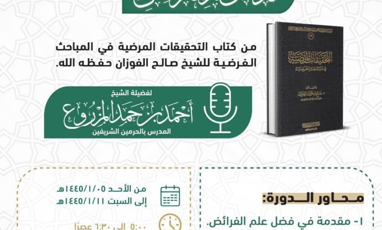 تُقيم وكالة الرئاسة للشؤون التوجيهية والإرشادية بالمسجد الحرام ممثلة في الإدارة العامة للشؤون التوجيهية والإرشادية، دورة علمية بعنوان “مدخل علم الفرائض” من كتب التحقيقات المرضية في المباحث الفرضية للشيخ صالح الفوزان حفظه الله.