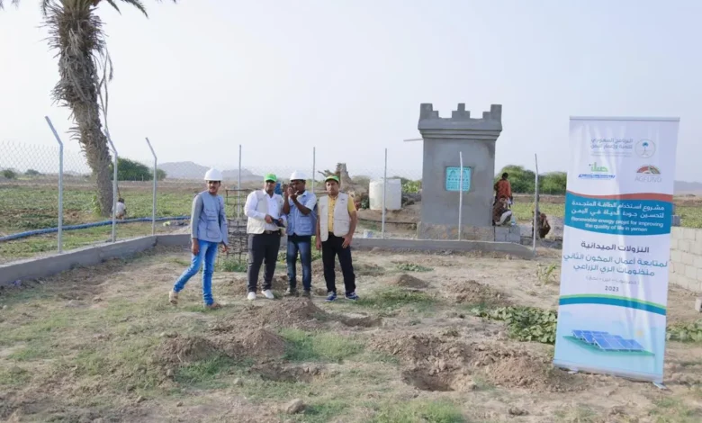 تفقَّد فريق فني من مشروع استخدام الطاقة المتجددة لتحسين جودة الحياة في اليمن،أعمال المكون الثاني من المشروع المتمثل بتنفيذ 35 منظومة ضخ لمياه الري الزراعي بالطاقة الشمسية في ثلاث محافظات يمنية؛ هي: حضرموت، أبين، ولحج،الذي يأتي بإسهام ثلاثي من البرنامج السعودي لتنمية وإعمار اليمن وبرنامج الخليج العربي للتنمية “أجفند” ومؤسسة صلة للتنمية.
