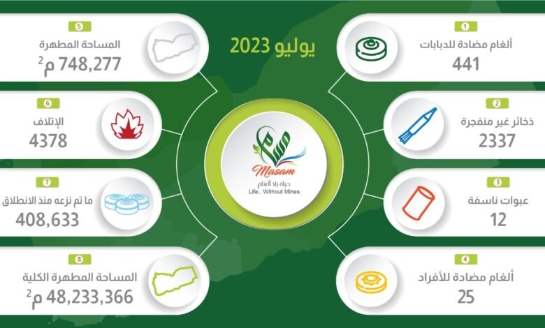 وعلى صعيد متصل، أصدر المركز الإعلامي لمشروع «مسام» لنزع الألغام في اليمن تقريره الشهري، عن شهر يوليو 2023م، حيث بلغ إجمالي ما تم نزعه في إطار مهمته الإنسانية المستمرة في هذا الشهر 2815 لغماً وقذيفة غير منفجرة وعبوة ناسفة.