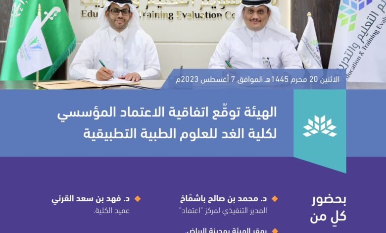 هيئة تقويم التعليم والتدريب توقّع اتفاقية تنفيذ الدراسة التقويمية للاعتماد المؤسسي لكلية الغد الدولية للعلوم الطبية التطبيقية