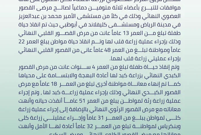 تمكن فريق المركز السعودي لزراعة الأعضاء من الحصول على ثلاثة موافقات للتبرع بأعضاء ثلاثة متوفين دماغياً لصالح مرضى القصور العضوي النهائي وذلك في كلاً من مستشفى الأمير محمد بن عبدالعزيز في مدينة الرياض ومستشفى كليفلاند في أبوظبي حيث تم انقاذ حياة طفلة تبلغ من العمر 13 عاماً عانت من مرض القصور القلبي النهائي وذلك بإجراء عملية زراعة قلب لها وتم انقاذ حياة مواطن يبلغ العمر 22 عاماً ومواطنة تبلغ من العمر 48 عاماً عانى من القصور القلبي النهائي بإجراء عمليتي زراعة قلب لهما.